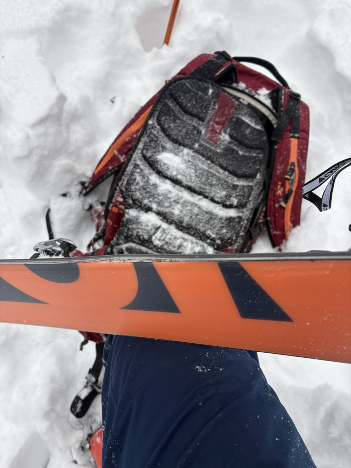 While skiing back to the car I hit a rock with the other (undamaged) ski quite hard, enough to visibly chew up the edge underfoot. Alas, this edge did not blow out! By contrast, the blown-out edge is virtually scratch-free. To me, this indicates that the ski was structurally compromised, likely due to a manufacturing defect, and was unable to withstand a light impact - which is a regular occurrence in backcountry skiing. (Fun fact: these are backcountry skis, and in the backcountry there are rocks, stumps, etc. hidden under the snow!).
