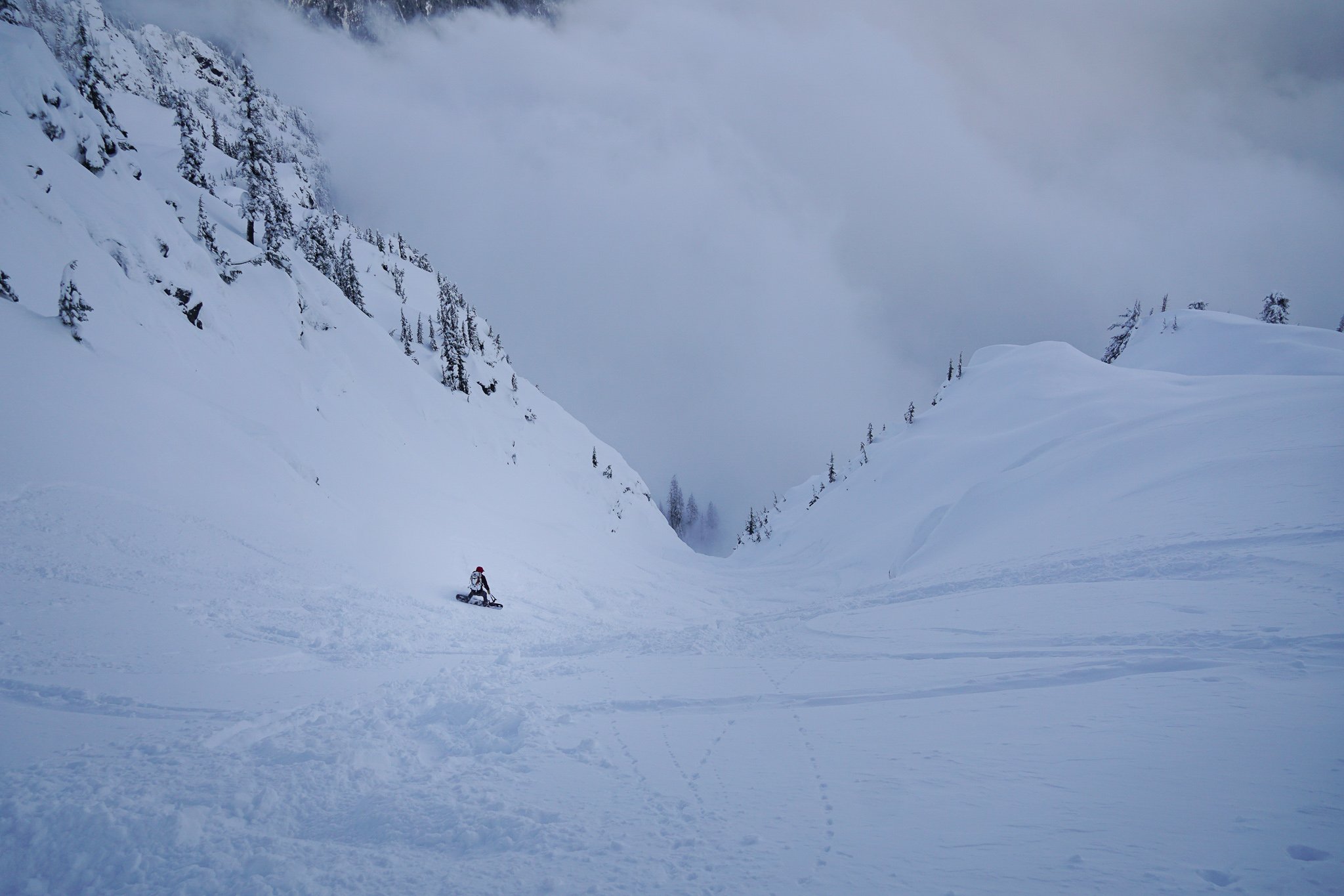 Began by following the skintrack from Alpental to Source Lake. The tour can be done in both ways, but we will describe counter clockwise. Ascend to Snow Lake Divide, the drop down to Snow Lake. Skin across Snow Lake and work your way up towards Mt. Roosevelt before cutting over to Chair Peak Lake. Continue up to Melakwa Pass. Enjoy a nice south facing descent to Melakwa Lake. Skin up to the col north of Bryant Peak and then ski Bryant Couloir directly down to Source Lake and out the cat track. If Bryant Couloir is too thin or sketchy, one can descend southwards into Great Scott Basin and through mellower trees to Source Lake.