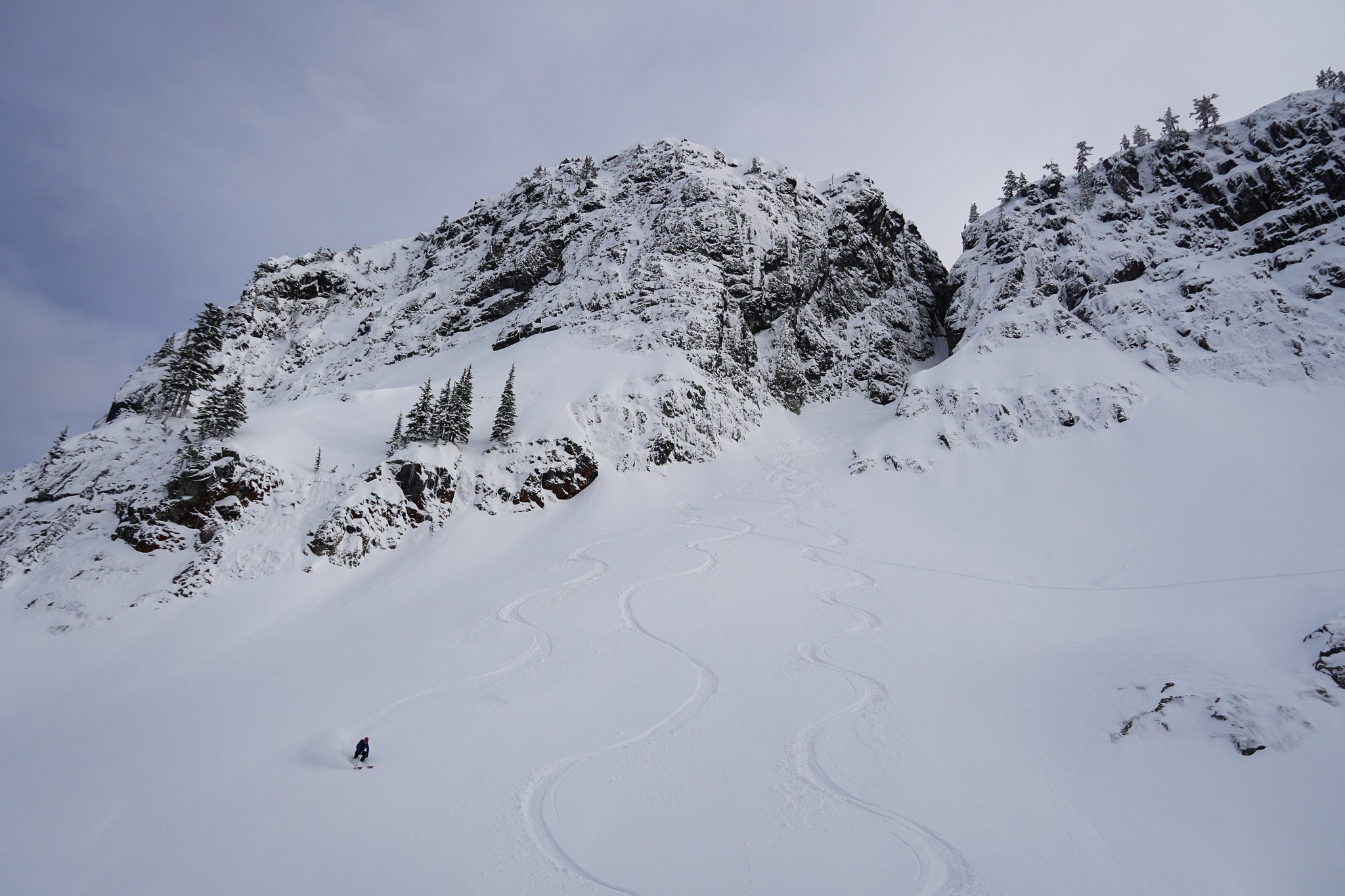 This is a very scenic tour. There are many options to expand this tour with great lines. Began with a longer climb to ski the north slopes of Chair Peak, beautiful rolling post glacial terrain, down to Snow Lake. Holy Diver, Cupcake, and Little Alien couloirs can be added with relative ease. The south face of Kaleetan adds in a big mountain feel.