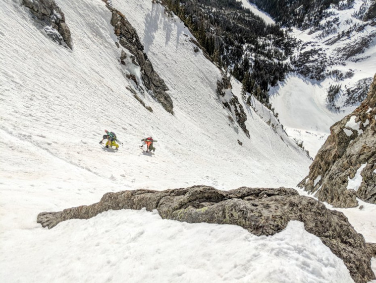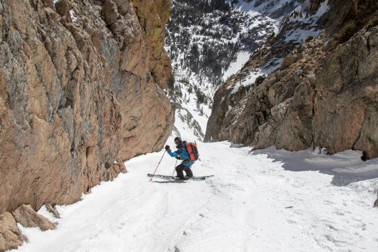 There are a couple of options for approaching this line. The bottom-up approach follows a summer trail, this time to Emerald Lake, one of Rocky Mountain National Park’s most popular hikes. The trail is easy to follow and usually packed down through traffic. Once at Emerald Lake, you will have eyes on the entire line and can start skinning towards the base of the couloir. Pick a protected spot behind a rock buttress to transition and start botting up the couloir. Once you get about ⅔ up the line, you will see a fork in the couloir. Most take the climber’s left fork and continue climbing up the increasingly tight couloir. Near the top of the line, you will encounter a short rock band that you will have to maneuver in order to top out on the line. Many skiers call it good at this point and ski below the rock band. The classic line, however, takes the climber’s right fork and into a steeper and narrower line with a sizeable cornice at the top.