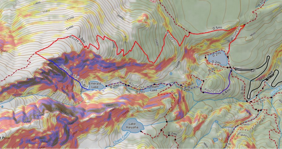 The top-down approach largely follows the Flattop Mountain summer trail and enters the line 0.7 miles short of the Flattop summit. There is some challenging route finding involved as there are a number of chutes from this aspect to pick from. Finding the proper entrance of the Dragontail Couloir can be challenging if not familiar with the line. Another disadvantage of this option is that you will not be able to assess the rock band before committing to skiing the line. If the rock is icy and you do not feel comfortable downclimbing, then you will have to turn around after only skiing a few feet. Also, consider that a benefit of this top-down route is that you will avoid booting up the line and subjecting yourself to overhead hazards.