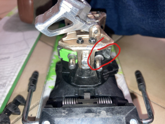 Hello, I am having an issue with a Dynafit heel binding (I believe it's a Radical ST 2): A plastic part (green on pictures) surrounding a release bolt is lost. As a consequence, the binding doesn't work as expected, and release immediately when I put myself "forward" on my skis.