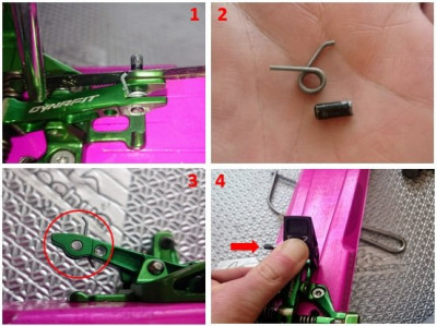 1. Take the old one pin and cut off small piece see picture. 2. This small piece will fix the spring in correct position. 3. Fix the spring in correct position 4. Press the spring with plastic excenter unit and push (pound in) the new pin.