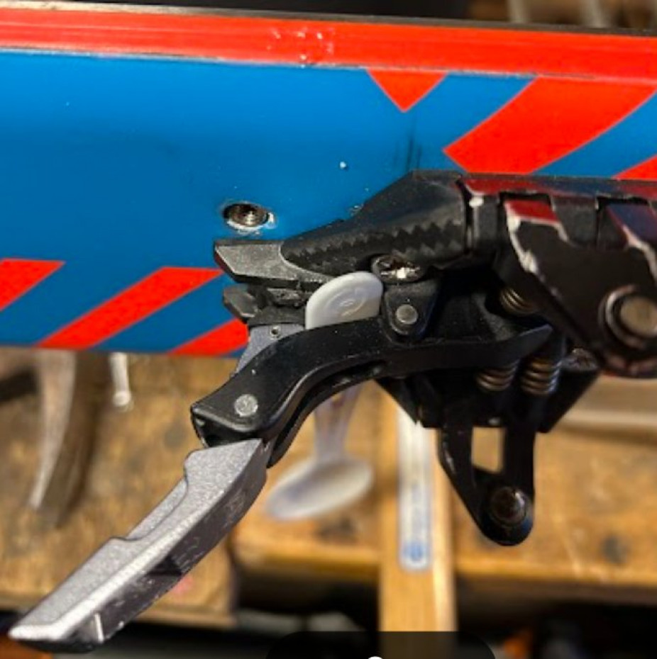 I tried to leave the pin hanging in the hole, for easy reinstall, like on a bike chain. No luck. With forceps/hemostat i could align the pin, and with slip joint pliers squeeze it in. If you have a magnet nearby-zap the pin and the lever arm so you don“t have to look far if you miss. Also, set the ski in vice sideways and propped toe lever with a spoon.