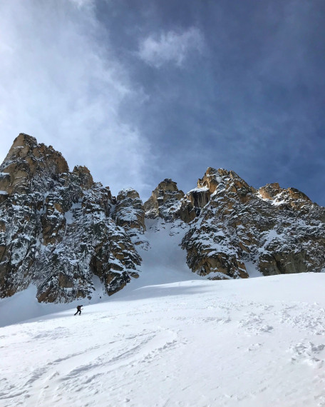 The most difficult part is likely the upper headwall of the line. It’s steep and exposed. Plus, the daunting nature of the peak essentially consumes your whole being.