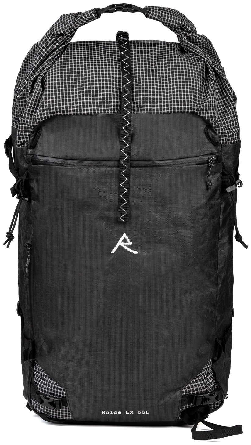 Tent, sleeping bag, 7 days of food, and the kitchen sink don't fit in a 20L race pack...we checked. Enter the Raide Research EX 55L, a 55L expedition pack that expands to 75L with back panel access and quick carry. The EX 55L inherits many of the features introduced by the LF 30L and the LF 40L, such as easy-access tool pockets, a large exterior stash pocket, modular ski carry, and the same durable Challenge Ultra 200TX. Extra padding in the shoulder straps and a removable aluminum frame help distribute weight to handle big loads. Raide also added additional padding to the hips, featuring two zippered pockets and a metal buckle to avoid plastic-buckle failures in the cold. The EX 55L's most genuinely clever feature is the collapsibility. The pack shrinks down to two inches giving it a similar profile to the LF series and making it so you don't have to ski with a refrigerator on your back.