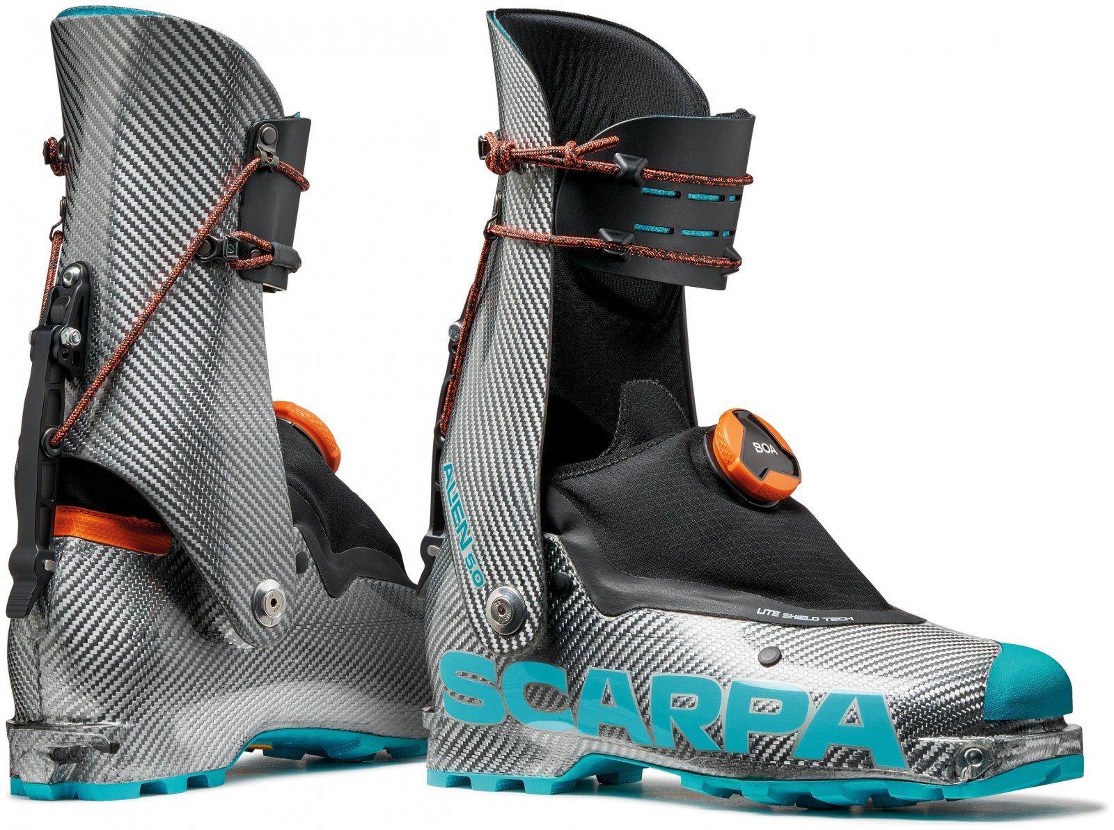 SCARPA's fifth iteration of its full-carbon Alien marks a paradigm shift in carbon boot colorways: silver! In addition to the sleek new Olympic-inspired color, the boot boasts thoughtful updates that come from a never-ending drive to reach the pinnacle of performance. An advanced carbon-wrapped 3D honeycomb structure adds insulation and rigidity without unnecessary weight. A new and improved U.F.O LB outsole, using Vibram Litebase, ensures a confident grip and minimal weight. The updated Race SL liner by Intuition provides comfort for the lower, while the pre-attached shin pad does the same for the cuff. More durable gaiter fabric rounds out the updates for this podium contender. The BOA fit system is retained for quick, on-the-fly adjustments. Made with pride in Asolo, Italy.