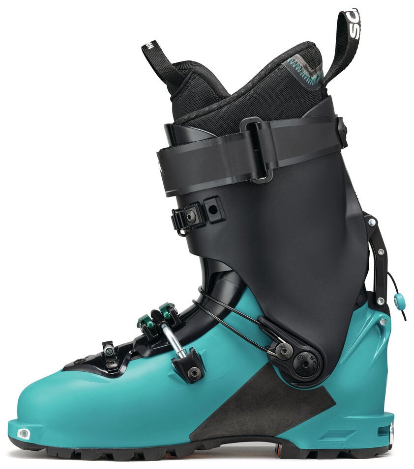 The Gea has long been a staple of women’s touring boot offerings, so it needs no dramatic introduction. It works, people know it works, and SCARPA has been sensible enough not to mess with it too much. The Pebax Rnew shell keeps things light without gutting the stiffness — at 100 flex, this boot will drive a real ski on a real descent, not just suggest a direction. While the downhill really shines on the Gea, the walk mechanism opens to 61 degrees of motion, which is generous enough that you’ll actually be able to stride on the skin track instead of shuffle. SCARPA’s Wave Closure system handles instep closure with fewer buckles than you’d expect and more hold than you’d hope for. The Heel Retention Strap keeps SCARPA fans coming back again and again. The Intuition Pro Flex Touring liner is choice — warm, moldable, and a meaningful upgrade over basic stock liners. Underfoot, a Vibram Cayman LT sole handles the approach without drama, so your touring partners need not worry about you on windswept ridges. If you are a woman looking for a capable all-around touring boot that doesn’t ask you to make painful compromises in either direction, the SCARPA Gea is a reasonable place to stop looking.