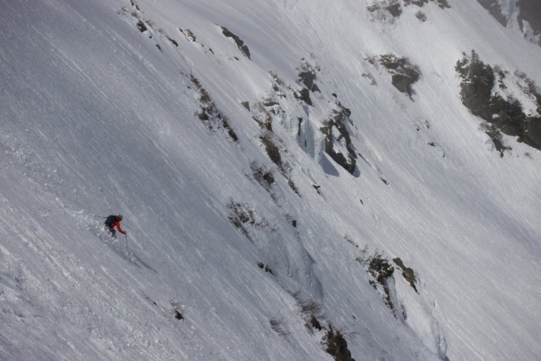 There are few places on the planet like Tuckerman Ravine in spring. if you’re looking for a quiet solitary backcountry experience, this is not the place to go. It’s more like spring break including the drinking and scantily clad youths. But, that’s just the scene, let's get back to describing the line and the skiing. This is a great big open headwall with lots of descent options. Most of the lines are quite steep, but don’t last that long. They are all very straightforward in that what you see is what you get and you can see and get them all quite easily. Conditions can vary, but with many aspects to choose from there good odds of finding the goods. Wet slides in the spring can be a real hazard as well as your fellow skiers falling and flailing down the mountain. Enjoy!